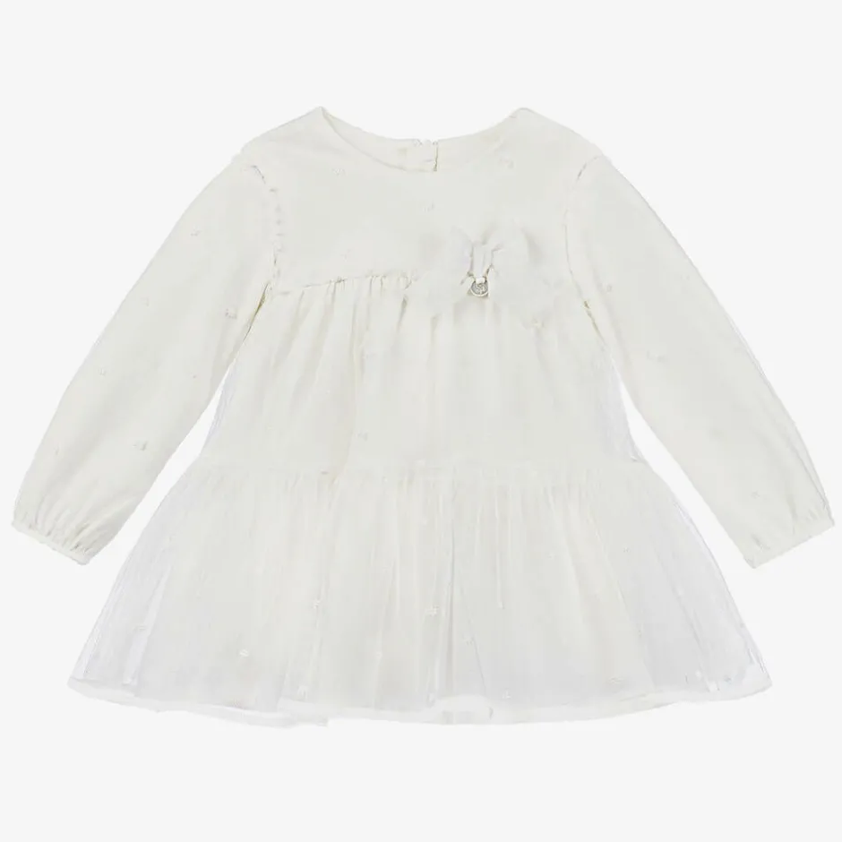 An ivory tiered dress for baby girls by Mayoral, lovely for smart occasions. Beautifully decorated, the tulle fabric is detailed with dainty flower embroidery and trimmed with frills. It has a fabric bow with a pearlescent charm on the bodice, a comfortable cotton lining, and a concealed zip to fasten on the back.