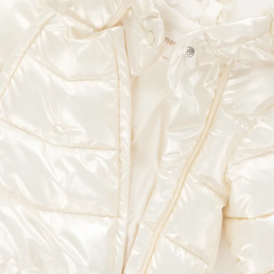 Ivory snowsuit for baby girls by Spanish brand Mayoral, with a lustrous sheen. Beautifully warm, it has a fixed hood and mid-weight padding, with detachable booties for extra cosiness. Fully lined in jersey for comfort, it has a double front zip fastening for easy dressing. The zip fastening between the legs and poppers securing the booties enables the snowsuit to become a snowbag.