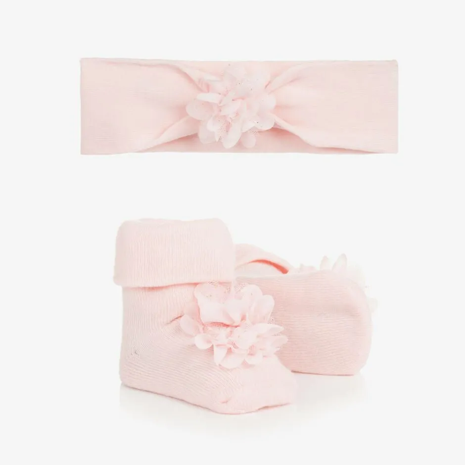 A delightful pink headband and booties set for baby girls by Mayoral. Both pieces are made from a soft cotton-blend knit and are decorated with pretty gold dotted tulle appliqué flowers for a sweet look. Comfortable to wear, they will be a lovely addition to any outfit.
