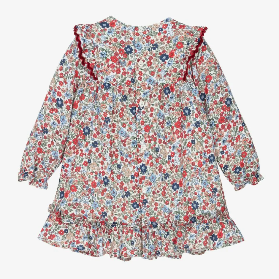 Sweet red and blue cotton dress for baby girls by Spanish brand Mayoral. Patterned with a charming floral print, this puffed sleeved dress has smart pintuck pleats on the bodice with red velvet ruffles and a little bow. It is lined in soft cotton for comfort against little one's delicate skin and fastens with buttons on the back.