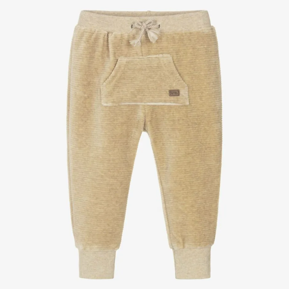 Beige joggers for baby boys and girls by Mayoral, made in softly textured corduroy. They have an adorable pouch pocket on the front and decorative ties on the stretchy waistband. The ankle cuffs are gently ribbed for greater comfort.