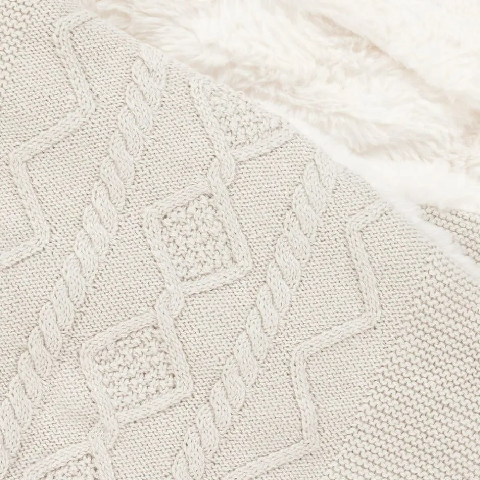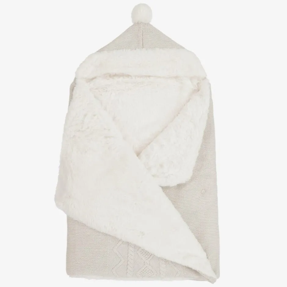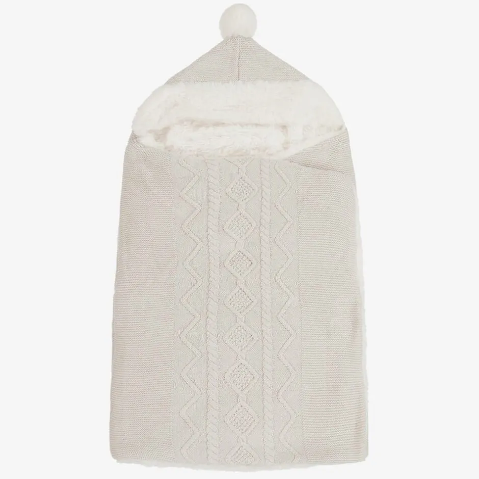 Beige nest for baby boys and girls by Spanish brand Mayoral, knitted in a soft cotton blend with a cable and diamond pattern on the front. Lightly padded, it has a warm hood with a cute, faux fur pom-pom on the top, and a beautifully soft, faux fur lining for extra cosiness. The nest fastens easily with concealed popper fastenings on one side.
