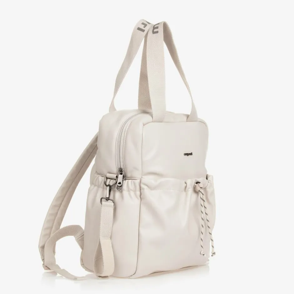 An ivory changing backpack by Mayoral, made in faux leather and lined in silky logo-patterned twill. Cleverly designed to store baby's essentials, it has a velcro-closing side pocket suitable for wipes or tissues, an inner foil-lined, insulated bottle holder, and multiple pockets. This practical bag has a two-way zip fastening and a front pocket with a drawcord detail. The bag includes a silky, padded changing mat. The branded carry handles and clip-on buggy straps are made in durable canvas, while the adjustable shoulder straps are padded for comfort.
