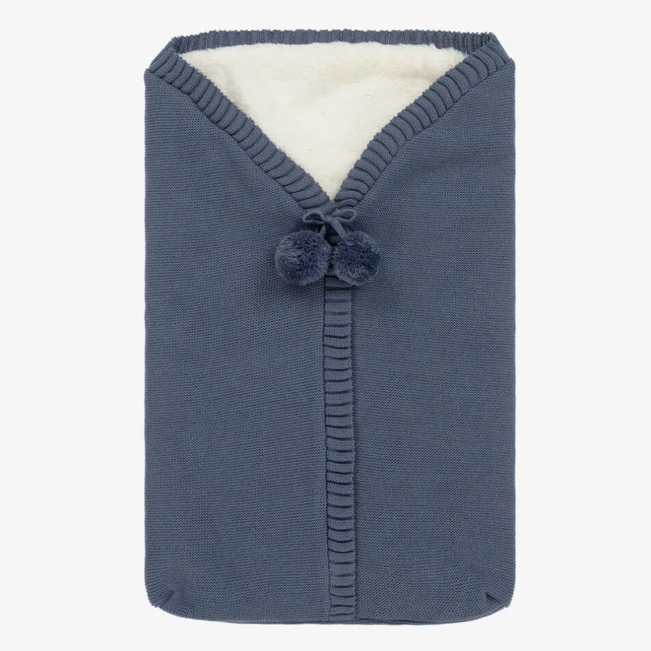 Super snuggly, knitted baby nest for boys and girls by Spanish brand Mebi, in a lovely blue shade. It is lined in luxuriously soft ivory plush faux fur to keep your little one cosy and has a concealed front zip fastening. There are ribbed trims and decorative pom-poms on the front.