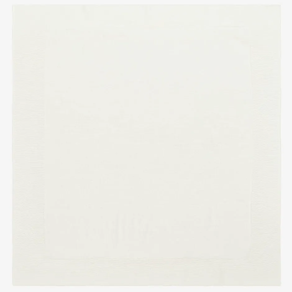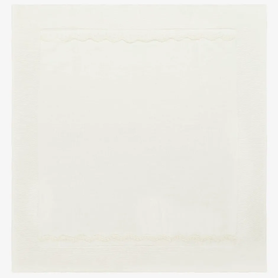 Ivory blanket for baby boys and girls by Spanish brand Mebi. In a soft knit, it has a pretty floral-embroidered lace trim on the front. Ideal for use in the car seat or stroller, this lovely blanket also makes an attractive nursery accessory.