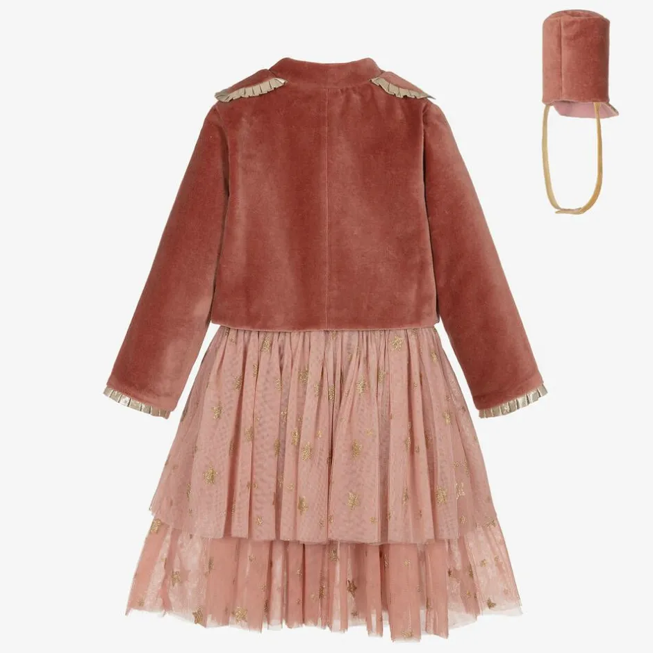 Magically transform into the nutcracker in this pink soldier costume for girls by Meri Meri. Beautifully crafted in velvet, the dusky pink jacket and hat have glittery gold stars and tassels decorated on the front. Fully lined, the jacket fastens with hooks and the hat secures with a stretchy velcro strap. A delicate light pink tulle skirt completes the outfit, featuring a sparkly elasticated waistband and a star pattern.