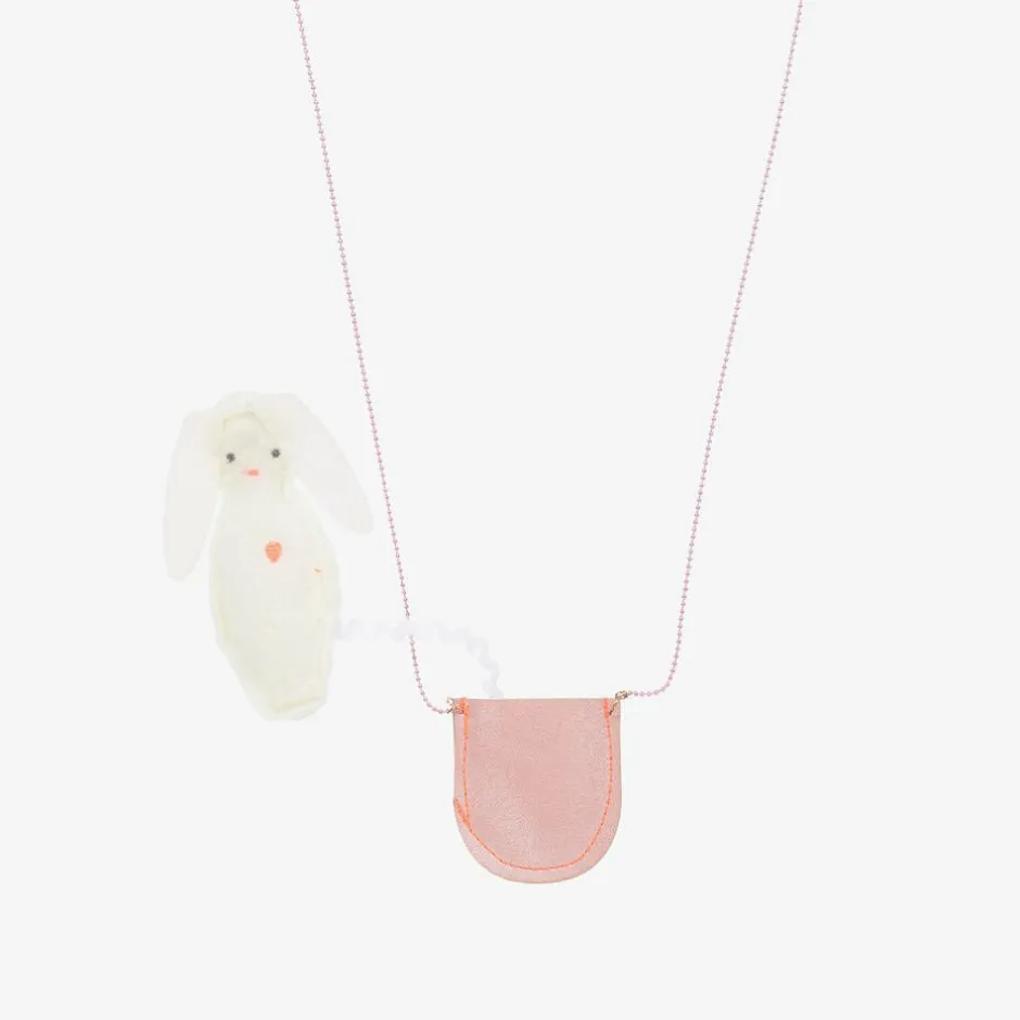 Super sweet, this pink and ivory necklace for girls is by Meri Meri. It features a softly padded felt and faux leather bunny rabbit pendant on a pink metal ball chain, with a rose gold logo-embossed tag at the back. Slipping easily over the head, it will add an adorable finish to any outfit.