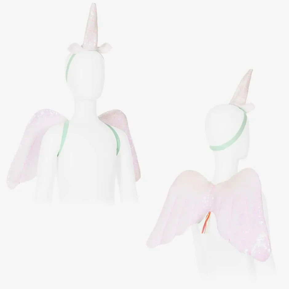 A white and pink unicorn dressing up costume for girls by Meri Meri, sparkling with iridescent sequins. Dreamy and magical, the wings have pastel-coloured satin tassels and glittery green elasticated shoulder straps. A matching horn headband completes the look, fastening effortlessly with velcro.