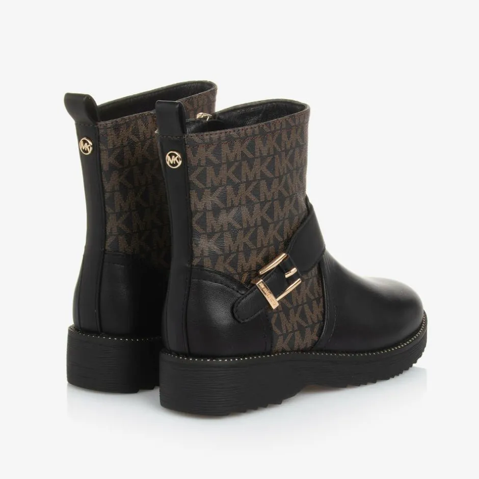 Black and brown faux leather boots for girls by Michael Kors Kids, patterned in the designer's signature MK monogram. They have branded gold metal hardware, studded detailing, and a decorative buckle strap. Lined in sparkly soft textile, with chunky non-slip rubber soles, they fasten with a side zip and have a useful heel tab.