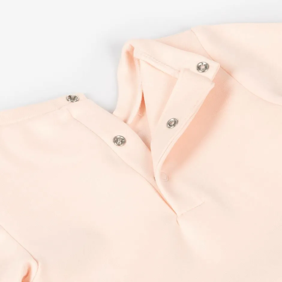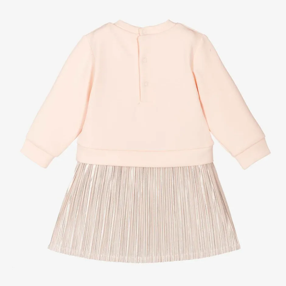 A lovely pink dress for little girls by Michael Kors Kids, with a sparkly silver sequin heart logo to catch the eye. A comfortable layered look, the soft jersey, sweatshirt-style bodice fastens with poppers on the back. The satin plissé skirt has fine silver stripes for a beautiful shimmery effect.