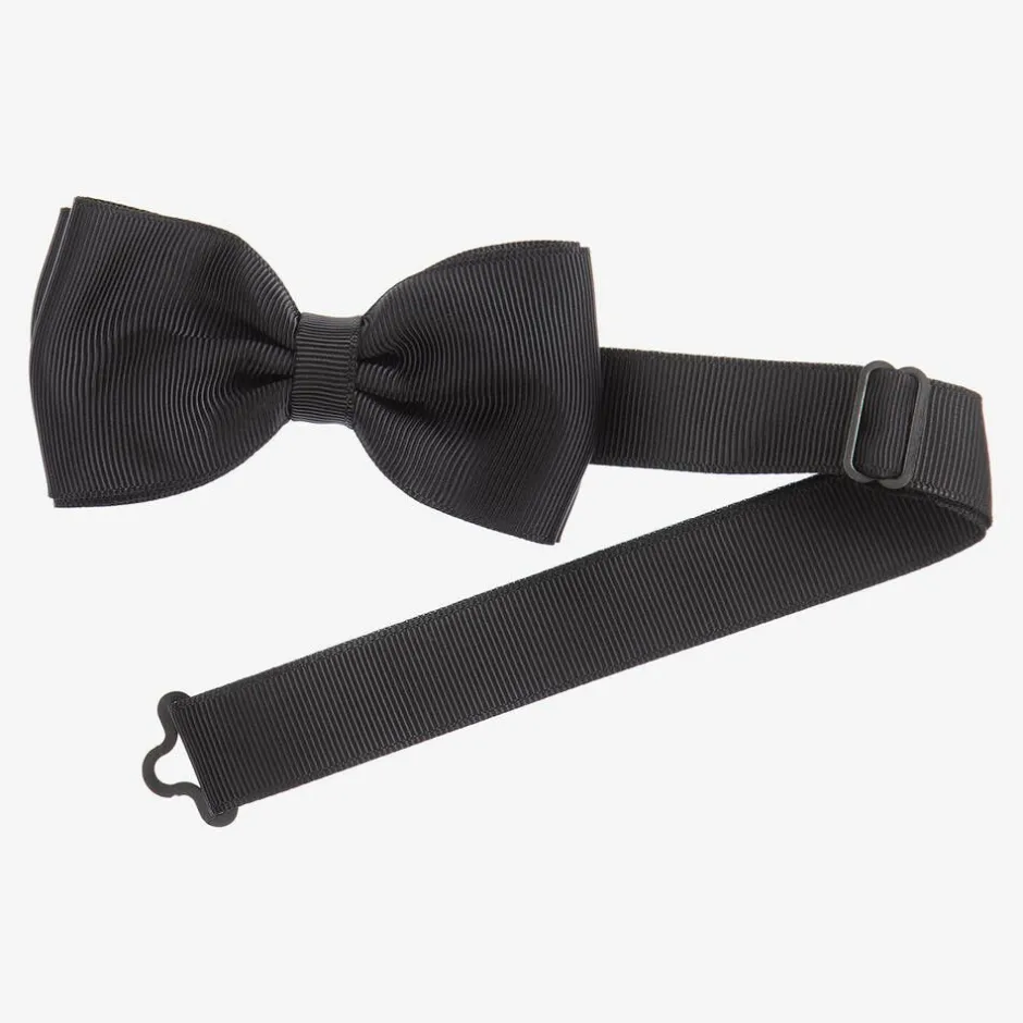 Smart black bow tie for boys by Milledeux. It is made in grosgrain ribbon and has an adjustable neck strap.