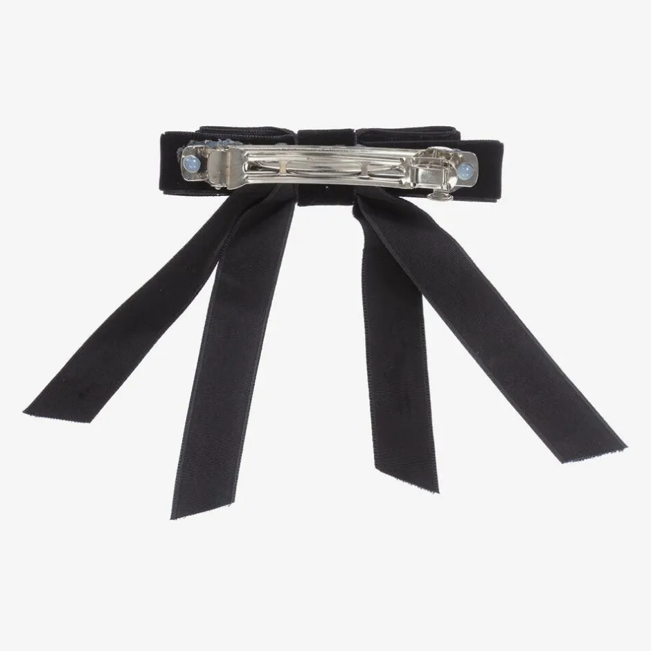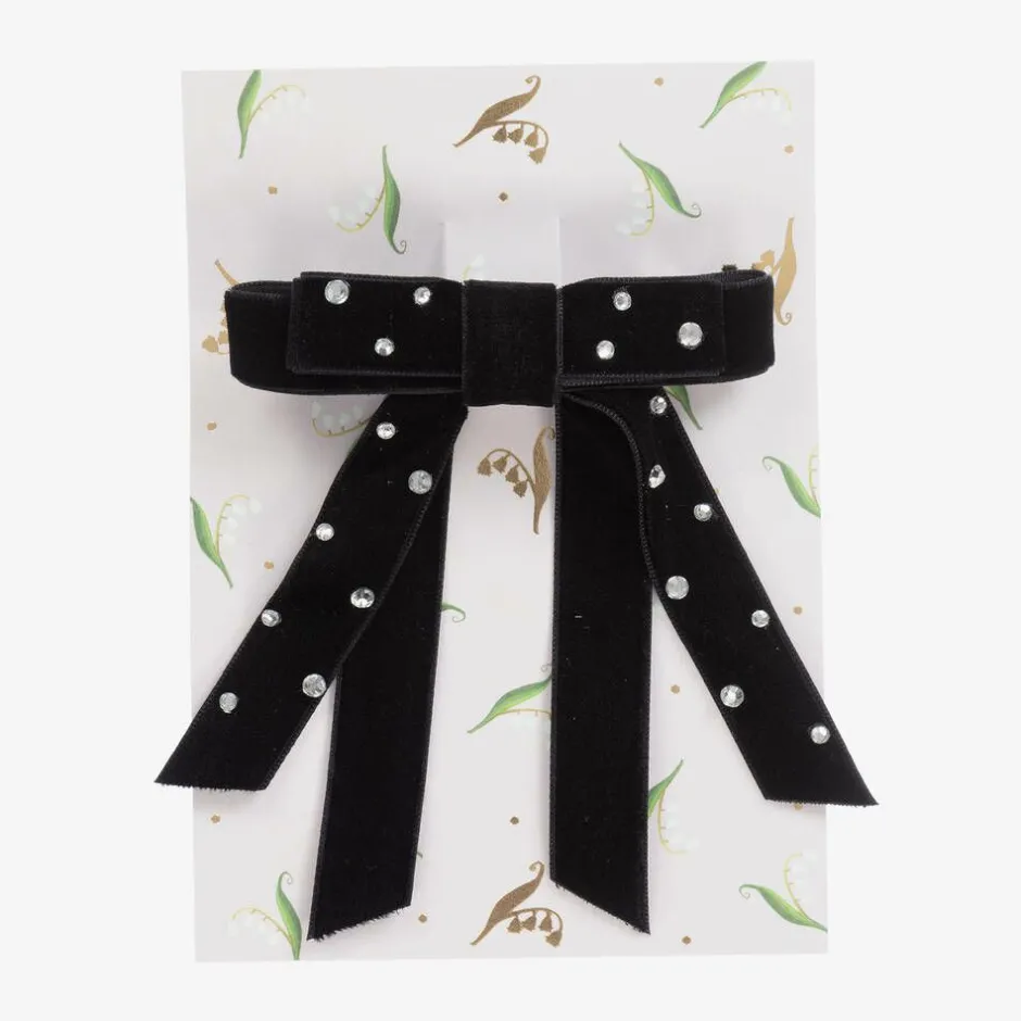 A pretty velvet ribbon hair clip for girls by Milledeux. The black bow is trimmed with sparkly diamanté and sits on a nickel free metal clip.