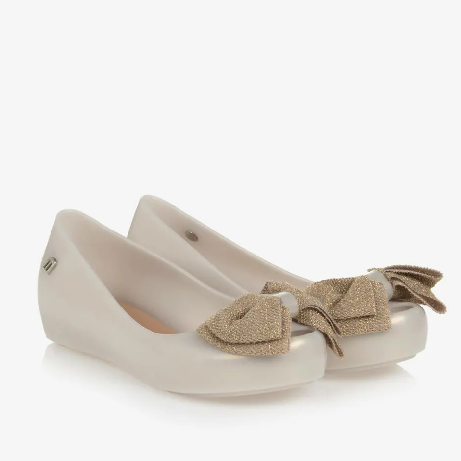 In a lovely pearlescent beige shade with subtle gold shimmer, these jelly ballerinas are by Mini Melissa. Made from flexible sweet-scented rubber, they have a comfortable padded insole and a non-slip outsole for better grip. Easy to slip-on, this peep-toe style has glittery gold and beige bow decorations on the toes and a silver logo stud on the heel for a branded finish.