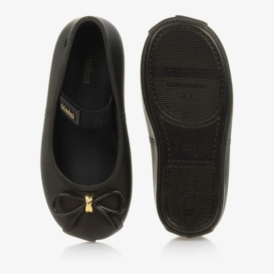 Dark brown jelly shoes for little girls by Mini Melissa, made in the designer's signature Melflex material. These bronze-effect shoes are designed like a ballerina pump, with a sparkly, elasticated strap across each foot for improved support. The padded foam insole ensures a comfortable fit, and the ridged outer sole helps with grip. A bow and metallic gold accent completes the look with a pretty finishing touch.