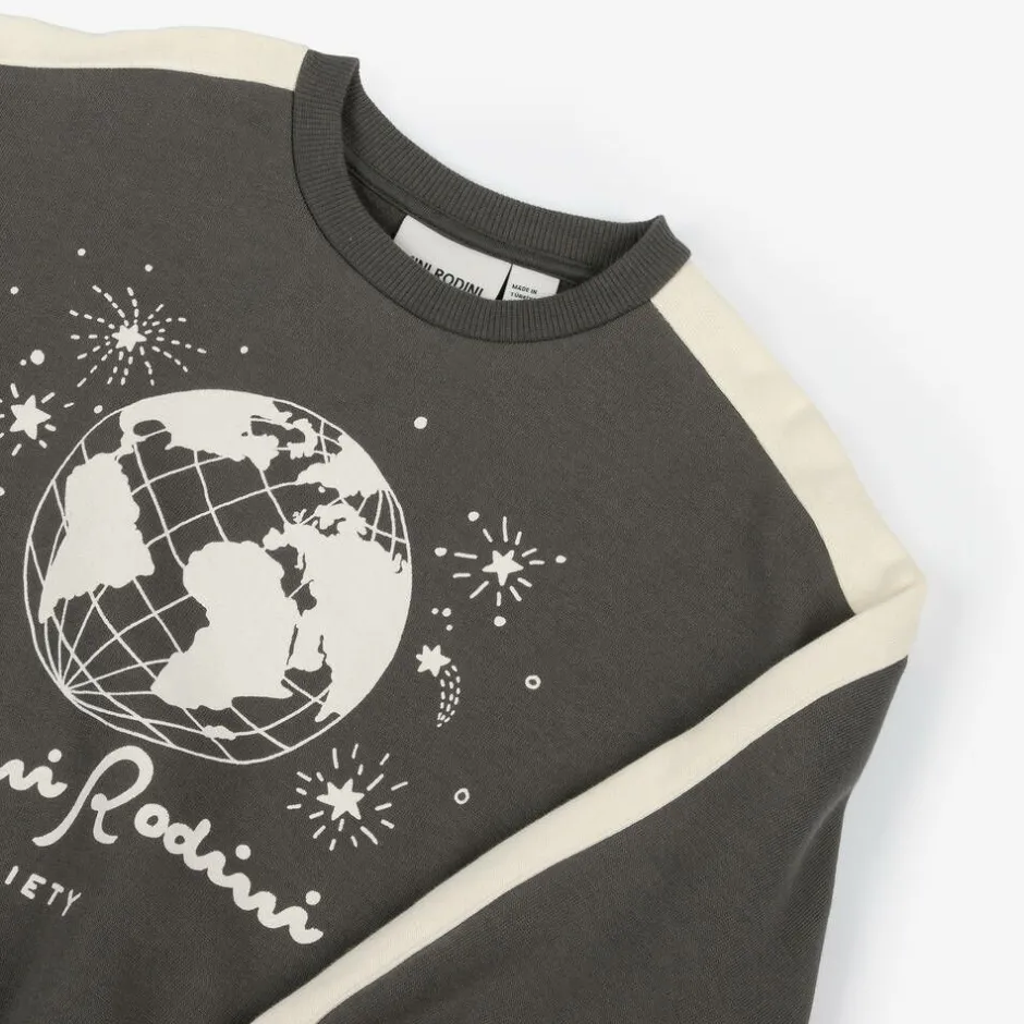 Casual grey sweatshirt for boys and girls by Mini Rodini, made in soft organic cotton jersey. This relaxed style has ivory stripes down the sleeves and an elasticated hem for a laid-back look. It has a sketched Earth print on the front, with the brand's script logo signed beneath.