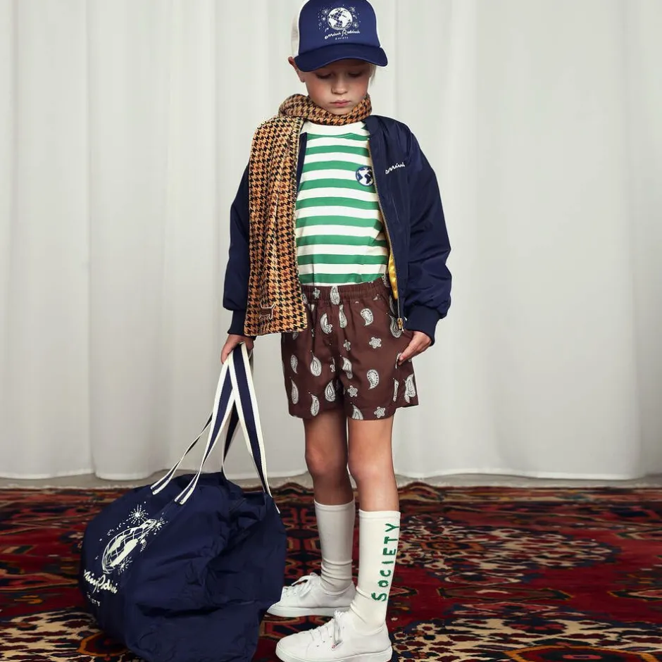Off-white knee-high socks for boys and girls by Mini Rodini. Made in a soft and stretchy organic cotton blend, these comfortable socks have a vertical, green 'Society' design on one side, with a logo underneath for designer appeal.