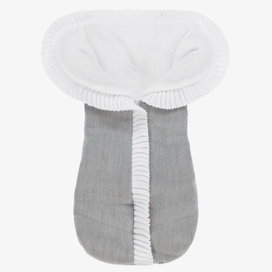 A lovely grey knitted baby nest for boys and girls by Minutus. Beautifully soft and warmly padded, it has a white knitted lining and knitted ruffle trims. There is a concealed front zip fastening, with a small branded tab at the bottom.