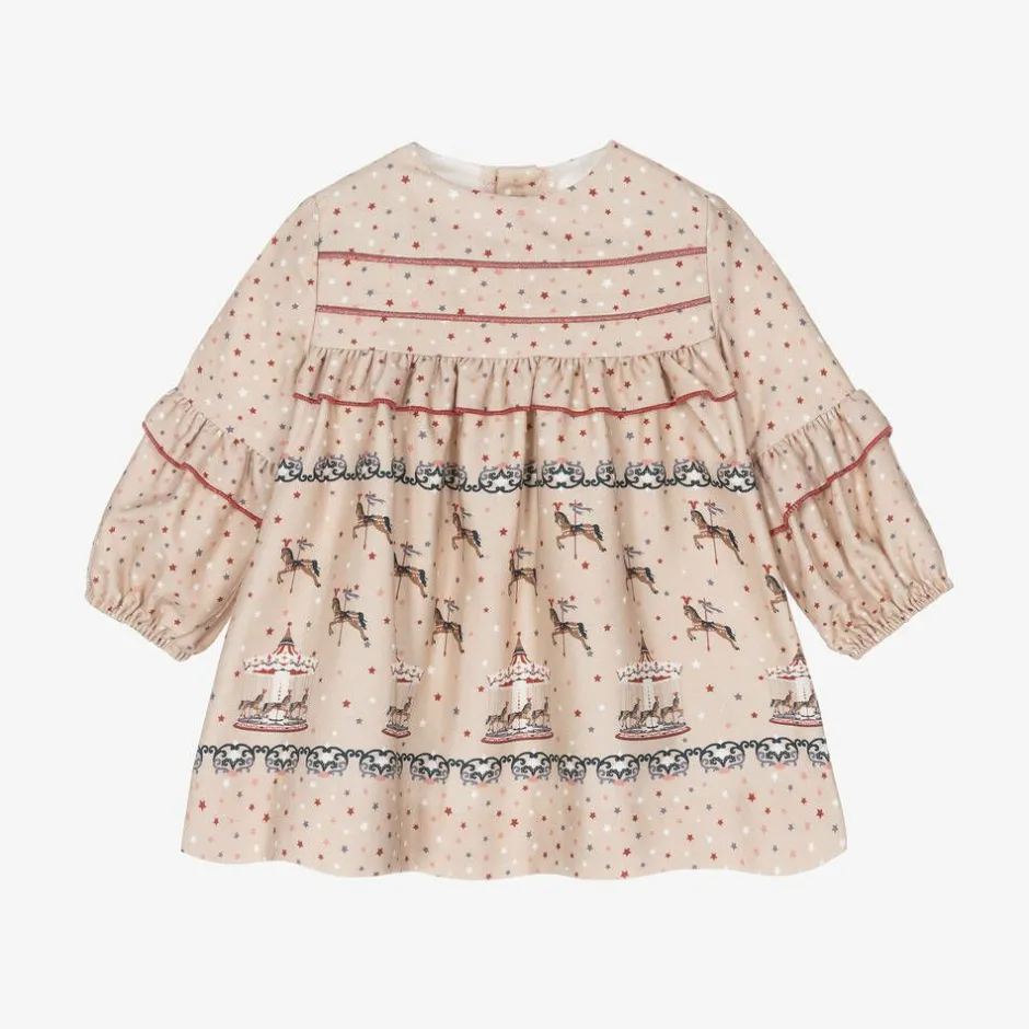Sweet beige dress for baby girls by Miranda, softly woven in cotton twill. Printed with playful stars and a whimsical carousel pattern, this cute dress has tiered ruffles on the bodice and long sleeves. Glittery red stripes add a touch of sparkle to the look. Lined for comfort against little one's skin, it fastens with classic buttons on the back.