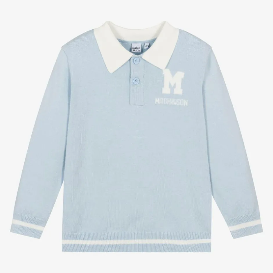 Pale blue sweater for boys by Mitch & Son, made in a soft knit. Styled like a polo shirt, it has a white collar and button fastening on the front for a fun stylish twist on a classic item.