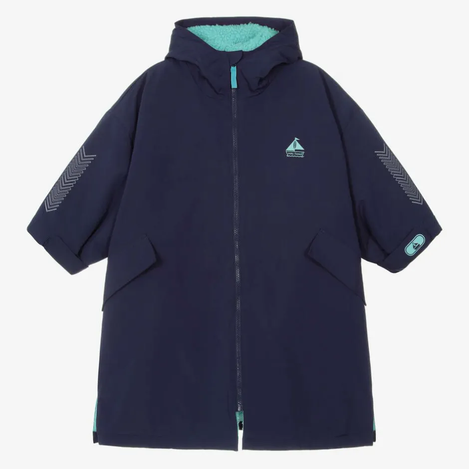 Cool, contemporary and practical, a navy blue hooded changing coat for boys and girls from Mitty James, exclusive to Childrensalon. This multi-functional outer layer is designed to help weather-proof an active lifestyle. Made in durable, water-repellent fabric that is both windproof and breathable, it has a cosy turquoise blue borg fleece lining. It is a relaxed-fit style, with two spacious front pockets protected by a flap and a secure, internal, zipped pocket. Additional practical features include a high neck with a chin guard, adjustable velcro cuffs, a split hem and reflective detailing on the sleeves and back hem for improved visibility. Equally at home on the beach or in town, it is complete with the British brand's distinctive logo motif on the chest and one cuff.