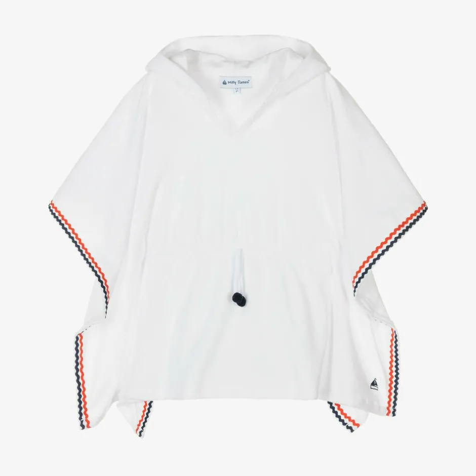 Exclusive to Childrensalon, a white hooded poncho towel for girls by Mitty James, with navy blue and white ric rac trims. Made in soft, absorbent towelling, it is ideal for wearing over a swimsuit on the beach or by the pool. It has a hood lined in soft jersey and an elasticated waist for a neat fit, with a faux drawstring and navy blue pom-poms. The brand's logo is by the hemline, embroidered in navy blue.
