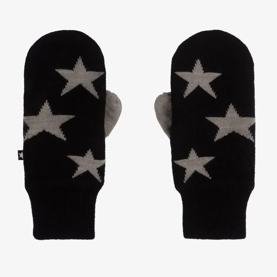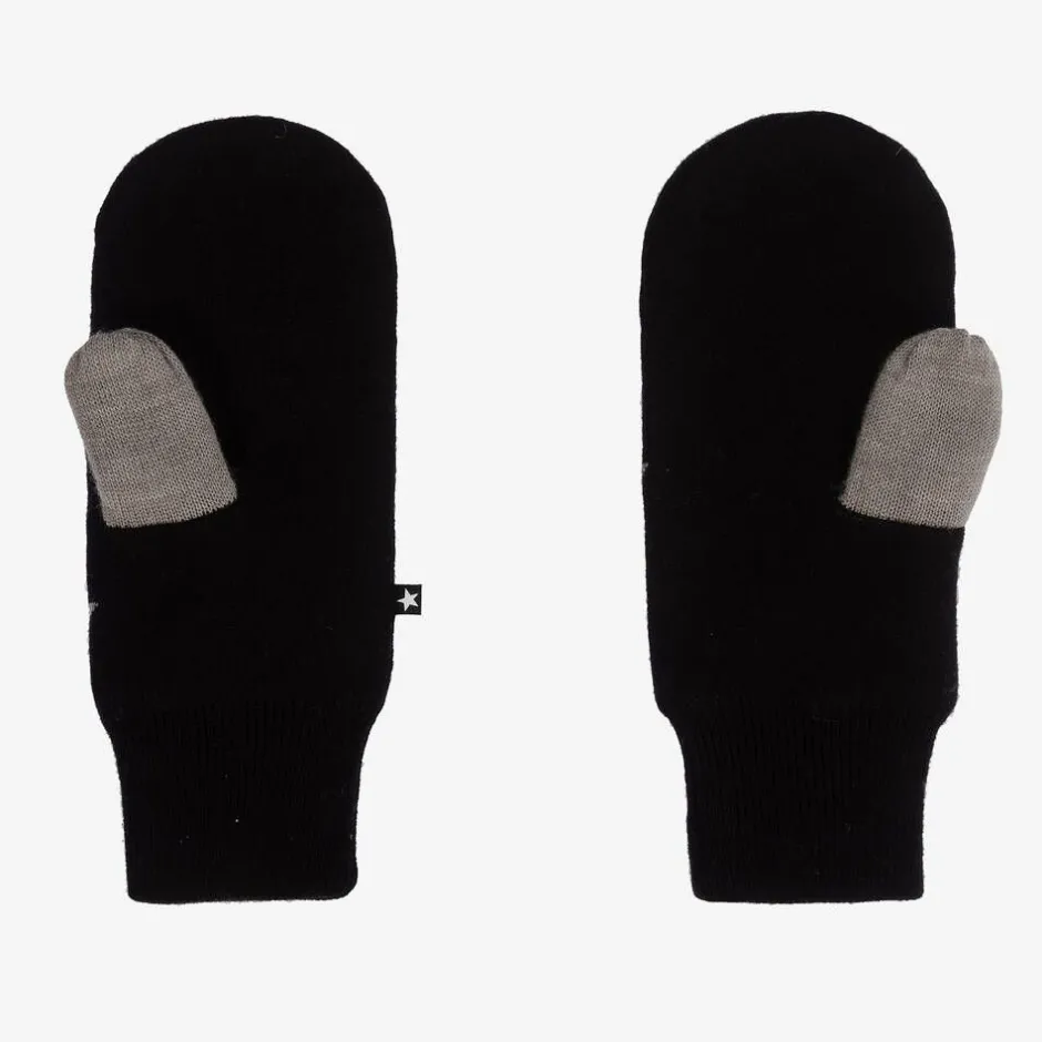 Black mittens for boys and girls by Molo. Ideal for cooler temperatures, they are knitted in a warm wool blend and have soft fleece lining for added cosiness. They have a grey jacquard star pattern with matching thumbs for a contrasting finish.