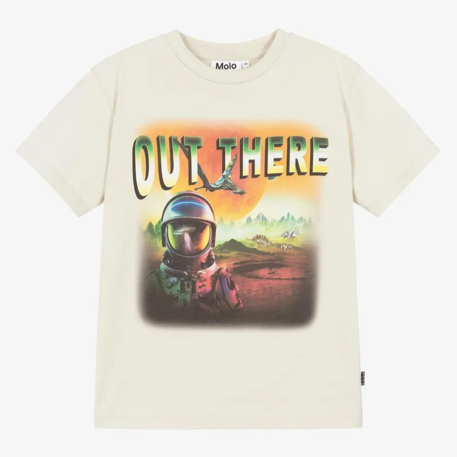 Beige organic cotton T-shirt for boys by Danish brand Molo, with 'Out There' and a colourful astronaut and dinosaur print on the front. Ideal for relaxed days, it is made in soft, comfortable jersey with a ribbed, crew neck and short sleeves.