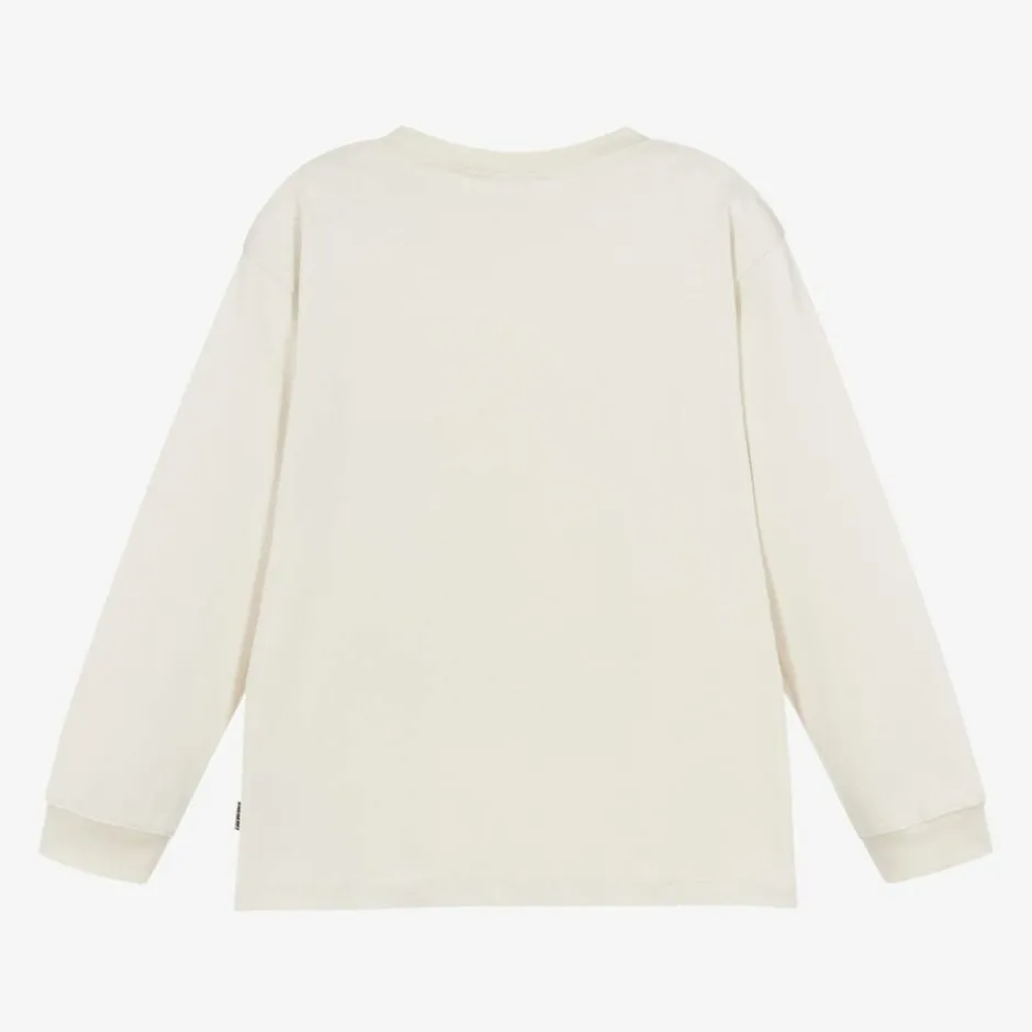 A beige top for boys from Molo, in a relaxed, comfortable silhouette. Alien encounter-themed, this cool top has a detailed UFO graphic on the front. The soft organic cotton fabric and dropped shoulders make this long-sleeved tee a great choice for laid-back days.