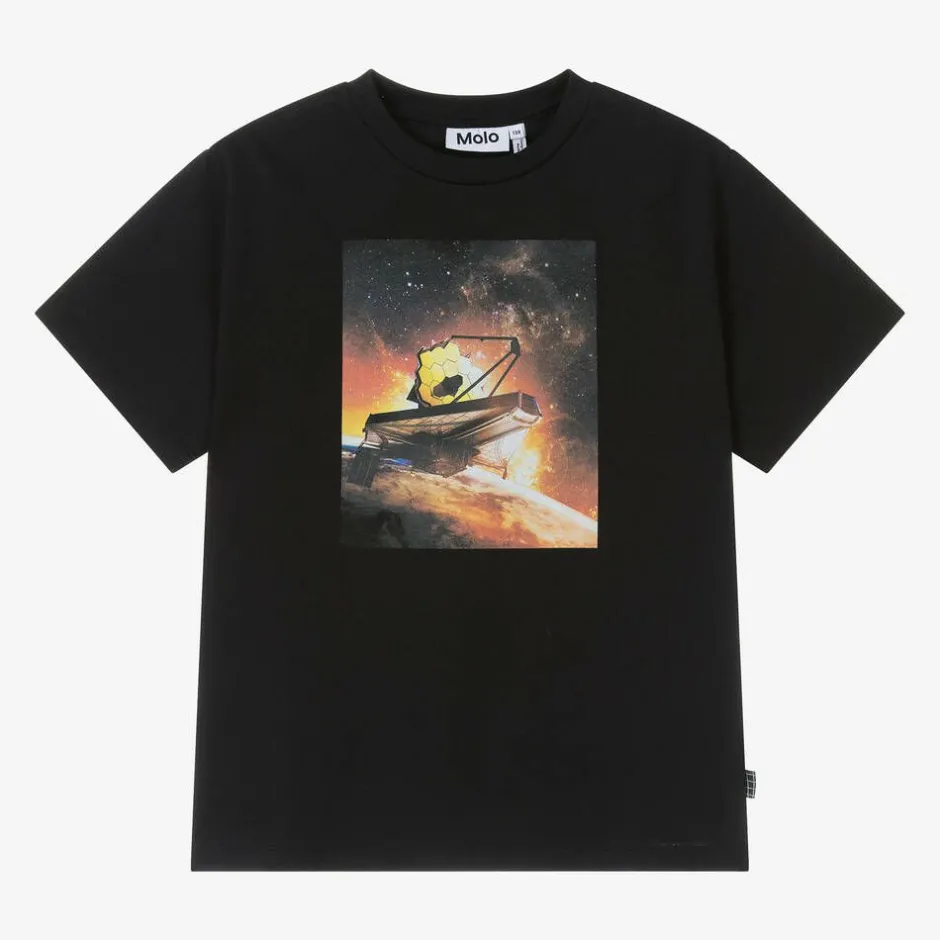 A black organic cotton T-shirt for boys from Molo, comfortable in an oversized silhouette. Great for astronomy lovers, it has a futuristic telescope and galaxy printed on the front. Dropped shoulders and the Danish brand's logo tab complete the style.