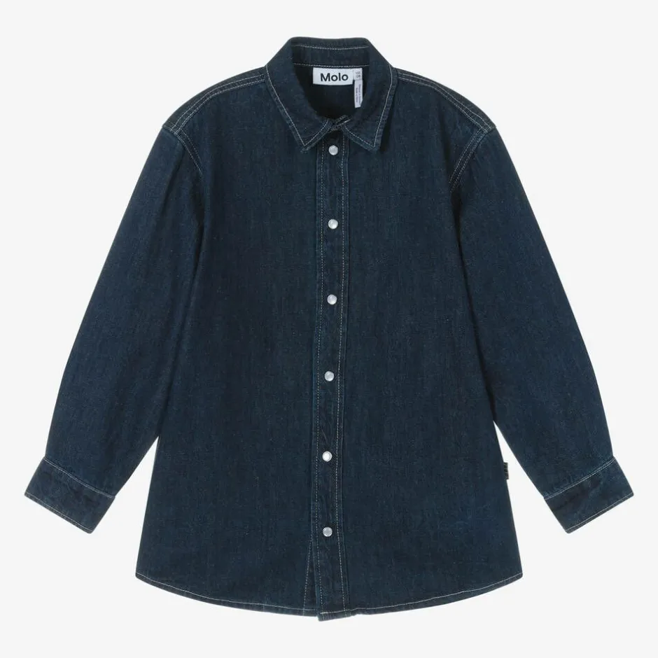 Dark blue-wash denim shirt for boys by Molo, made in soft, lightweight cotton and linen. Fastening easily with poppers on the front and cuffs, this relaxed-fit layer is a great choice for laid-back styling.