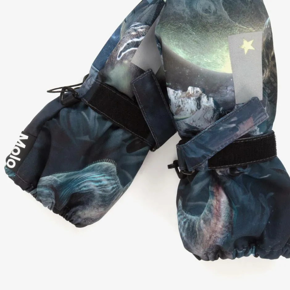 Navy blue ski mittens for boys by Molo, with a 'dinosaurs in space' pattern and reflective trims for improved visibility. Made using recycled materials, these waterproof, windproof and breathable mittens have lightweight, technical padding and a soft fleece lining for warmth. The long cuffs adjust with velcro, they have slip-resistant palms for good grip, and they can be clipped together to keep them safe when not in use.