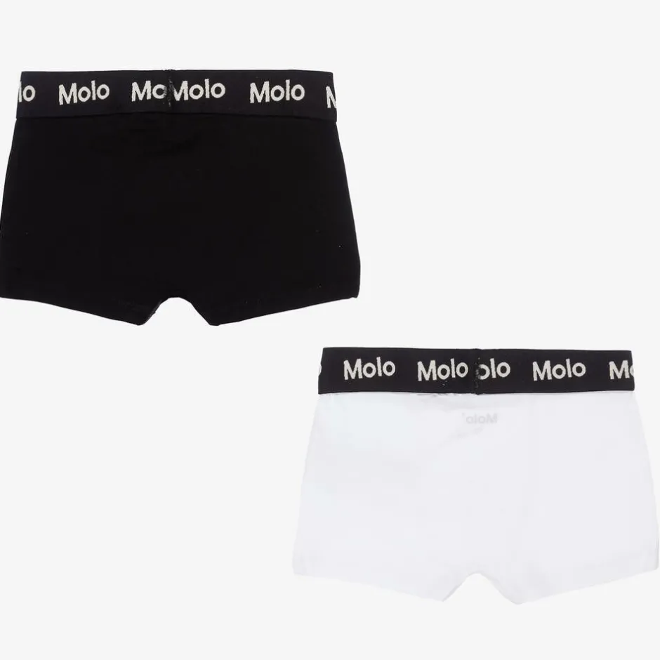 Pack of two black and white boxer shorts for boys by Molo, made in soft organic cotton jersey. For a comfortable fit, they have stretchy, elasticated jacquard logo waistbands.