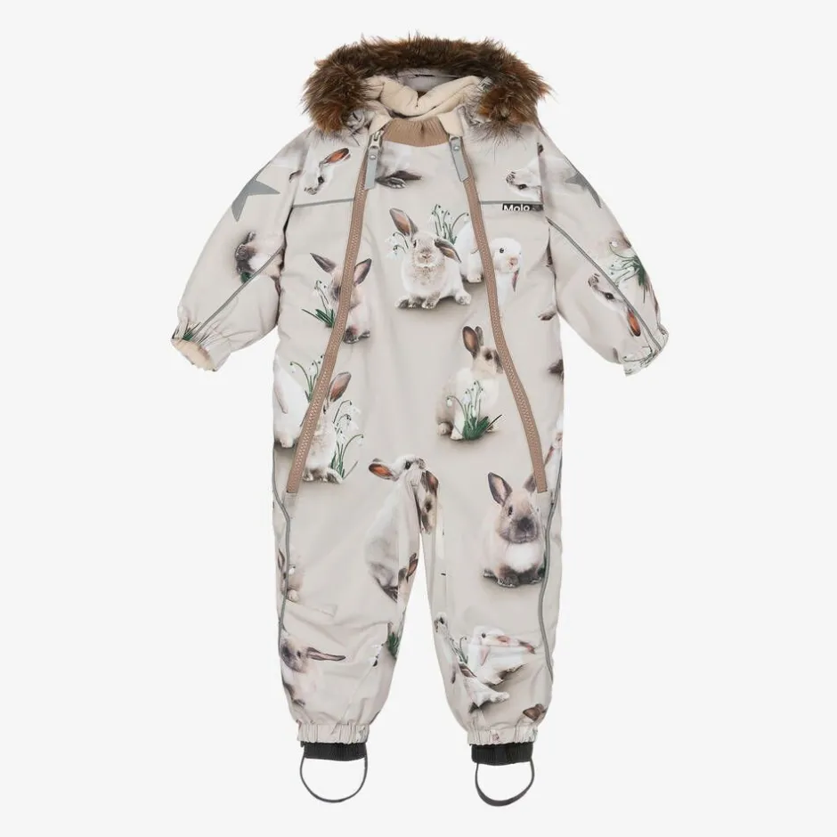 Beige technical snowsuit for little girls by Molo, with an adorable bunny and snowdrop flower print. This warmly padded, cosy snowsuit has a soft polar fleece lining and waterproof finish. Protecting your little one's skin, it is breathable, windproof and designed with a knitted panel and zip guards below the chin. The removable hood has a detachable faux fur trim and it has reflective panels for safety. There is a velcro-closing panel concealed beneath the two front zips and inner snow gaiters with removable rubber stirrups to fit comfortably in snow boots.