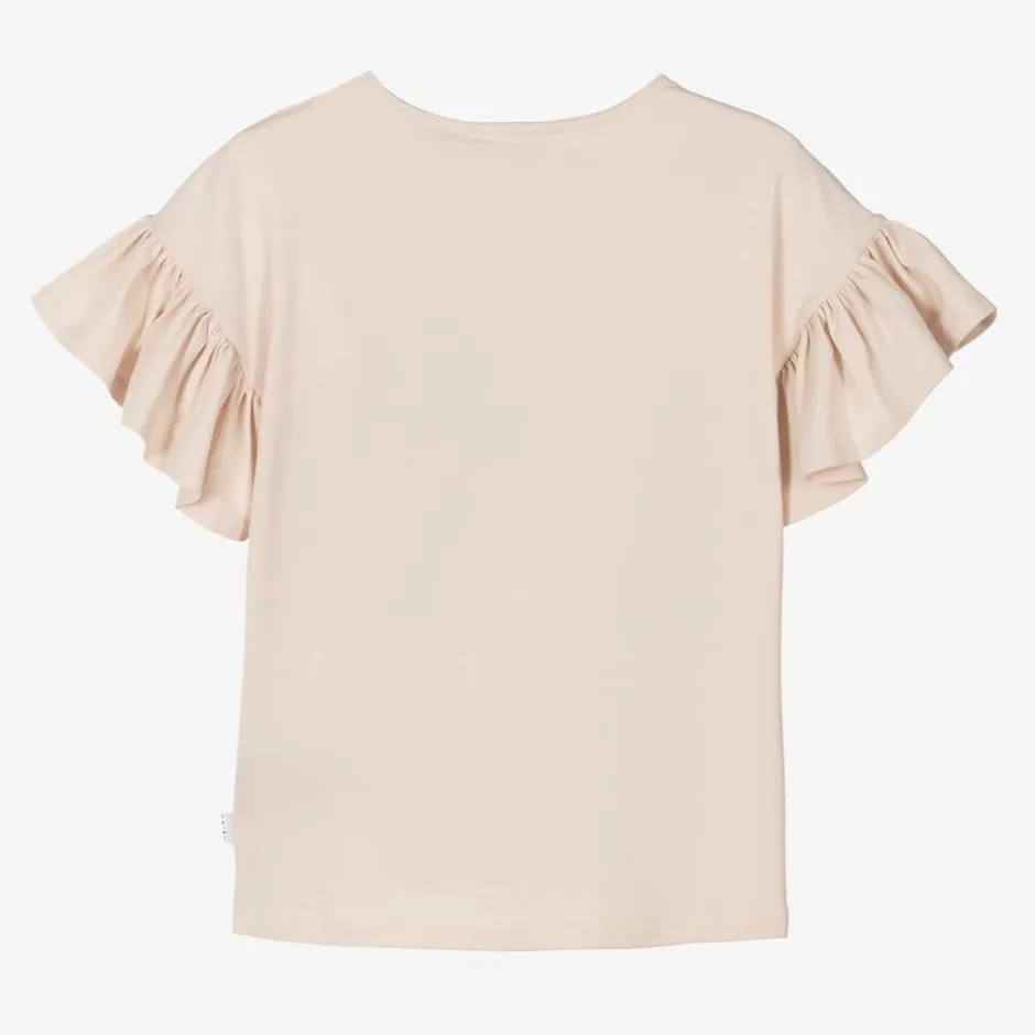A beige organic cotton T-shirt for girls by Danish label Molo, with bright pink and green accents. Made in soft jersey and designed with dropped shoulders, this fun top has ruffle sleeves and a quirky floral dove pattern on the front.