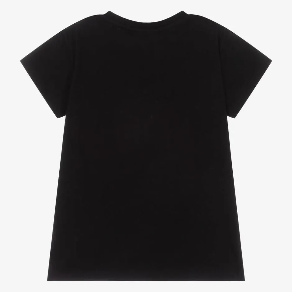 Black organic cotton T-shirt for girls by Danish eco-label Molo, comfortable in soft jersey. Adding shimmer and sparkle, two happy cherries are stitched on the front in orange, pink and blue sequins.