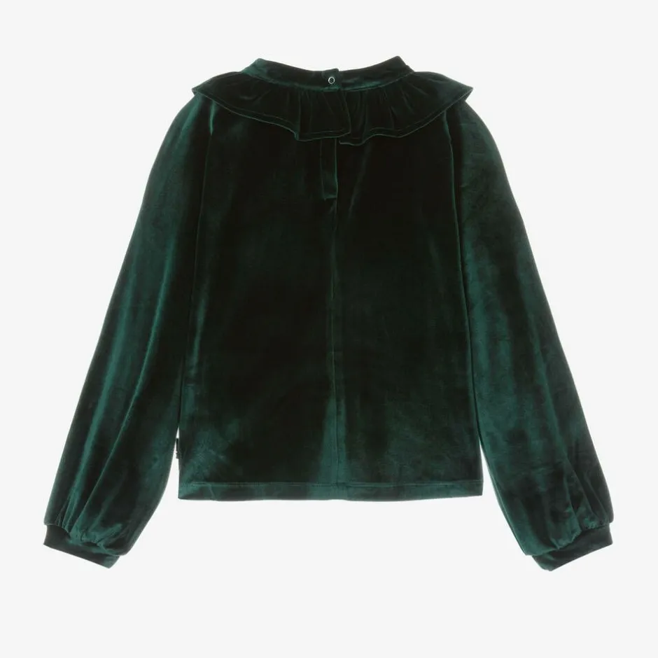 Lovely dark green velour blouse for girls by Danish brand Molo, beautifully soft with a smooth and velvety finish. Elegant and traditionally styled for both smart and casual looks, it has a ruffle trim around the neck and gently puffed long sleeves. To help with over-the-head dressing, it fastens with a popper on the back.