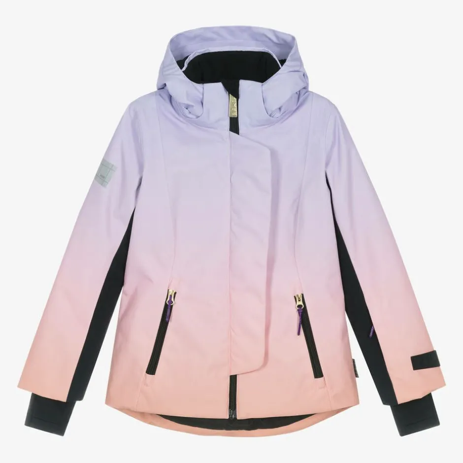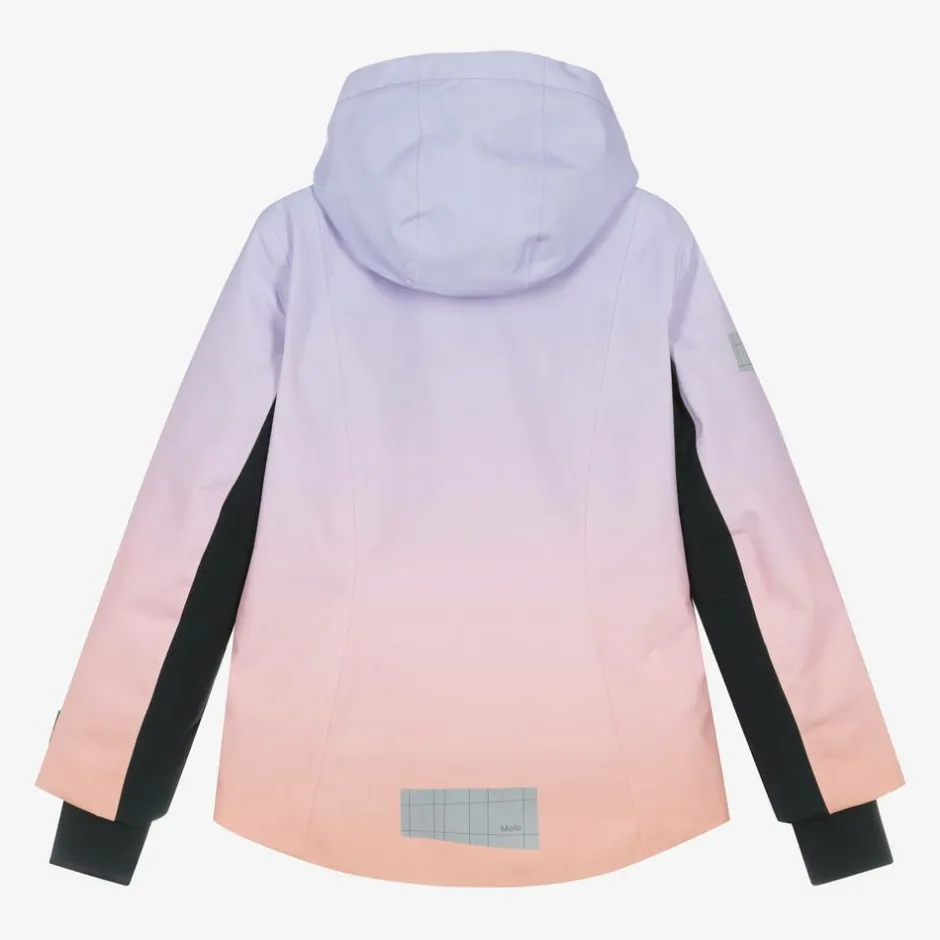 Technical ski jacket for girls by Molo, in gradient lilac purple and pink tones. Made from recycled fabric with waterproof and windproof features, it is insulated to withstand temperatures up to -25C and has a polar fleece lining with a mesh layer for breathability. This slope-ready jacket has reflective logo trims, a removable hood with an elasticated trim to fit easily over a helmet, zip-up front pockets and a ski pass pocket on one sleeve. There is an internal popper fastening snow skirt and stretchy cuffs with comfortable thumbholes. Covering the main zip, the storm flap fastens with poppers on the front.