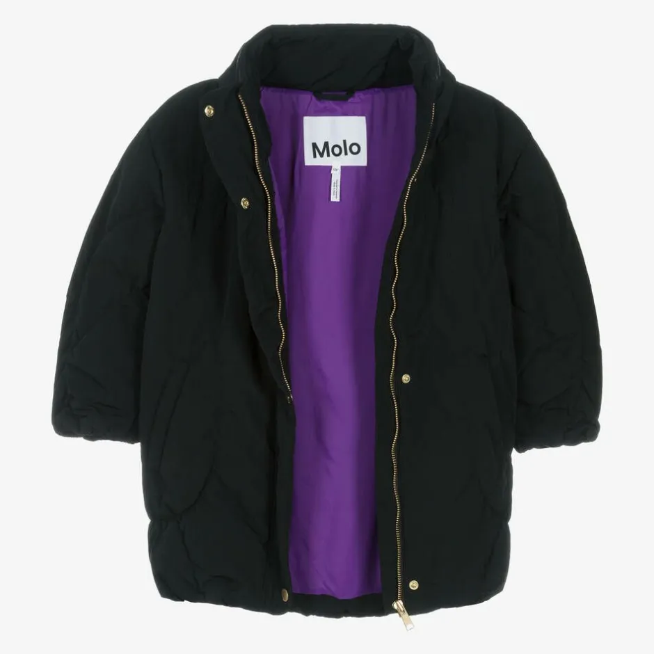 Cosy black coat for girls by Danish brand Molo, with mid-weight padding. It is made in slightly textured, recycled fabric with stylish, curved quilting and full sleeves. There is a velcro-fastening, concealed hood in the stand-up collar, as well as elasticated cuffs for extra warmth. The front zip fastening has a flap over to keep the cold out, secured with golden, branded poppers. There are useful, slanted front pockets and a purple satin lining for comfort.