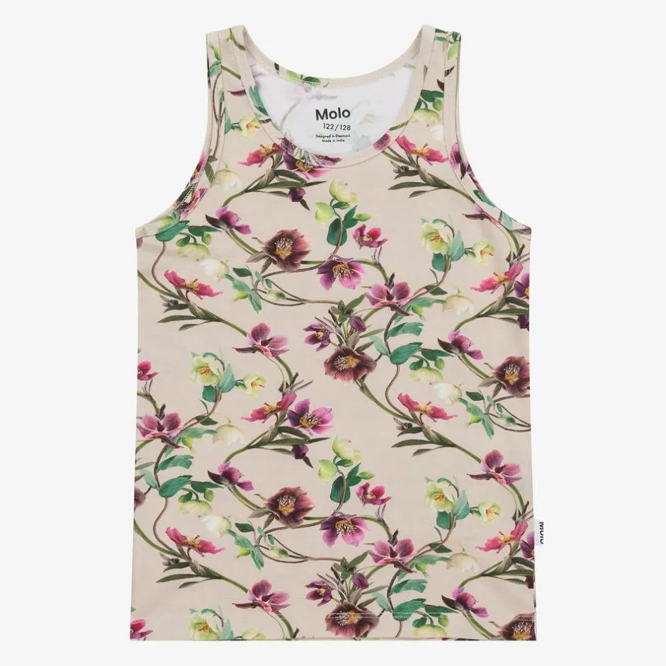 In a useful pack of two, these sleeveless vests for girls by Molo are made from soft organic cotton jersey. One top is in a plain mauve pink shade and the other is beige with a pretty floral pattern. Both pieces have a logo tab on the side seam for a branded finish.