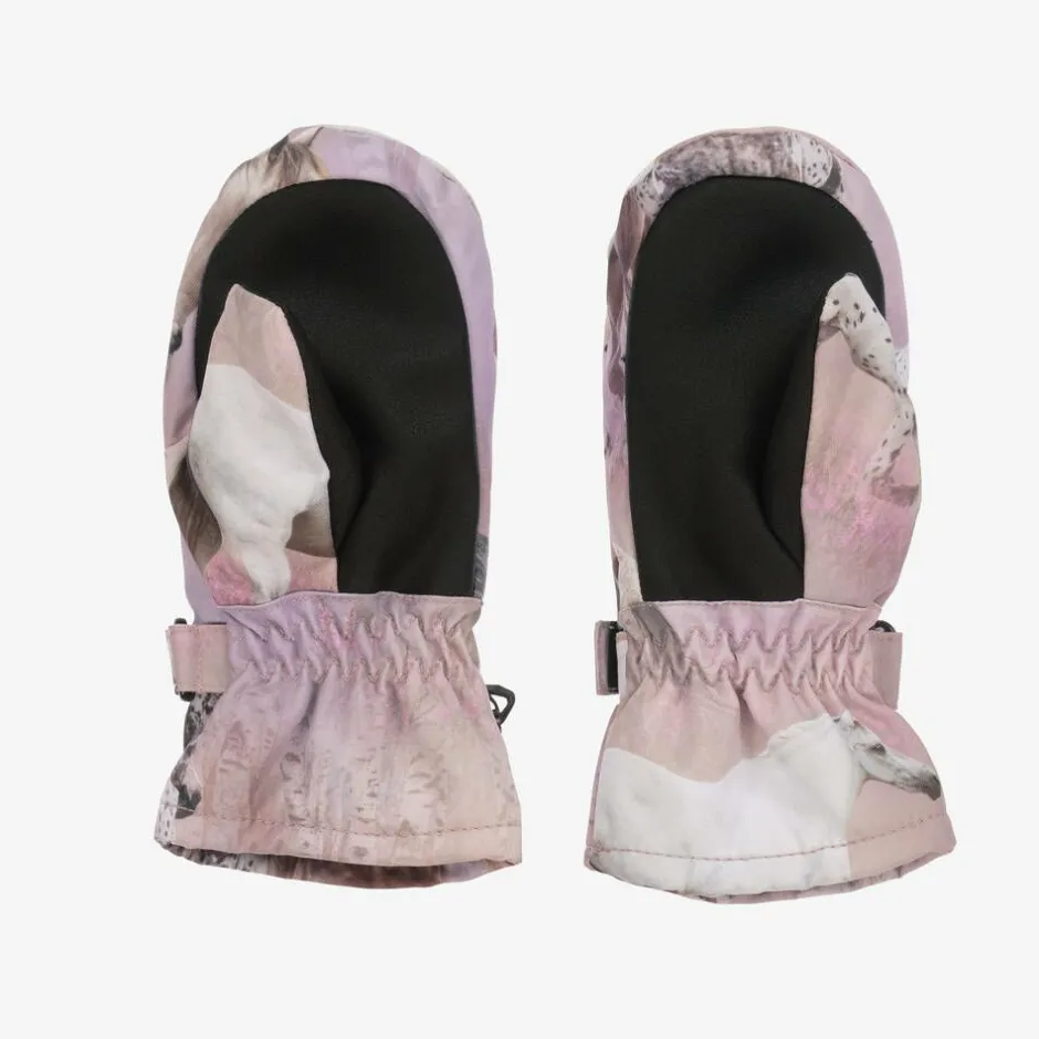 Dusky pink and lilac horse print ski mittens for girls by Molo, with reflective trims for improved visibility on the slopes. Warmly padded with technical insulation, these comfortable waterproof, windproof and breathable mittens are lined in cosy polar fleece. They have long, velcro-adjustable cuffs, a clip to attach them together, and slip-resistant palms for good grip.