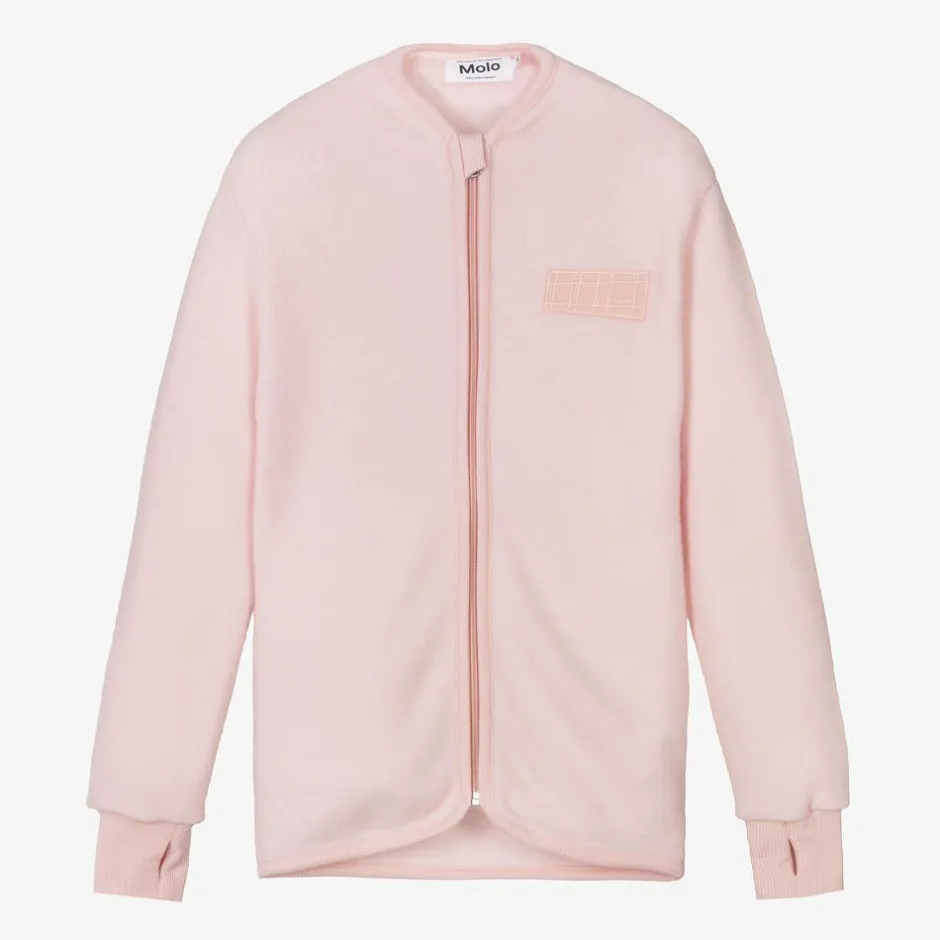 A fleecy pale pink zip-up top for girls by Molo, knitted in the finest Merino wool with a brushed feel. This long-sleeved top is ideal for adding an extra layer of warmth on cooler days. It features soft ribbed trims, a protective zip guard and integrated thumb holes on the folded cuffs. A logo patch is stitched on the chest for a branded finishing touch.