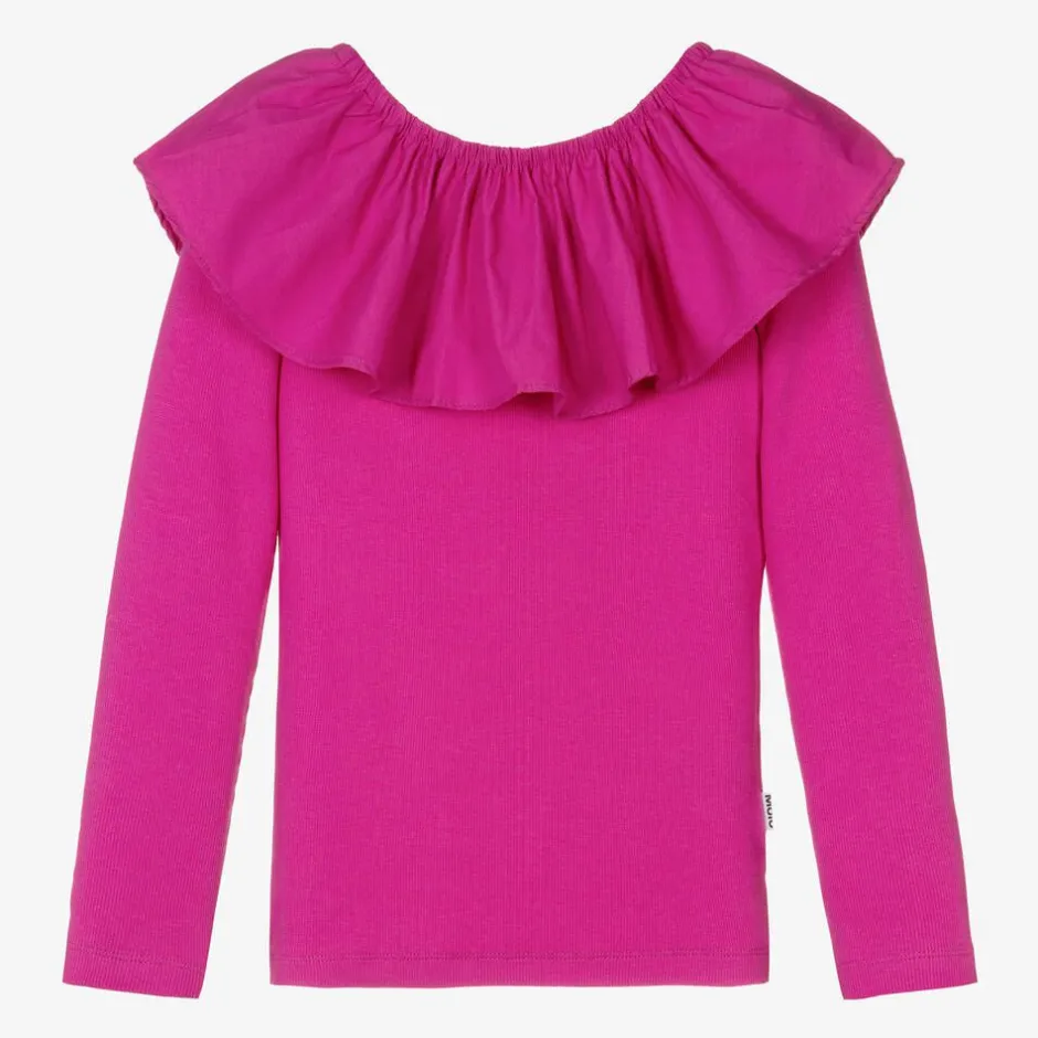 Stylish fuchsia pink long-sleeved top for girls from Danish brand Molo, made in soft and finely ribbed organic cotton jersey for comfort. The gently elasticated poplin ruffle around the neckline gives it a lovely silhouette or for an alternative look, this pretty top can be worn off the shoulder.