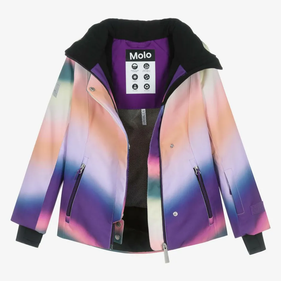 Technical ski jacket for girls by Molo, blending shades of orange and pink with purple and blue. Made from recycled fabric with waterproof and windproof features, it is insulated to withstand temperatures up to -25C and has polar fleece lining with a mesh layer for breathability. This slope-ready jacket has reflective logo trims, a removable hood with an elasticated trim to fit easily over a helmet, zip-up front pockets and a ski pass pocket on one sleeve. There is an internal popper fastening snow skirt and stretchy cuffs with comfortable thumbholes. Covering the main zip, the storm flap fastens with poppers on the front.