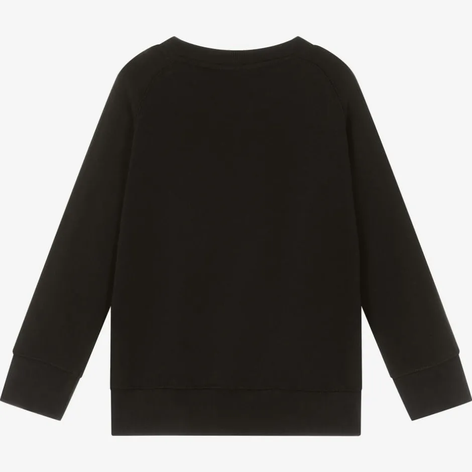 Fun black sweatshirt for boys and girls by Molo, made in soft organic cotton jersey. On the front, there is a happy, smiling face embroidered on the front. This casual sweatshirt has lightly ribbed trims, raglan-style long sleeves, and a fleecy inside for extra cosiness.