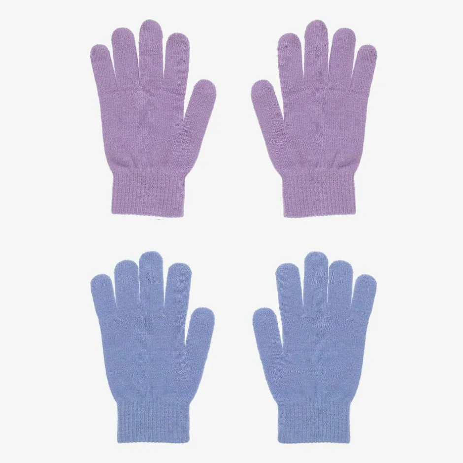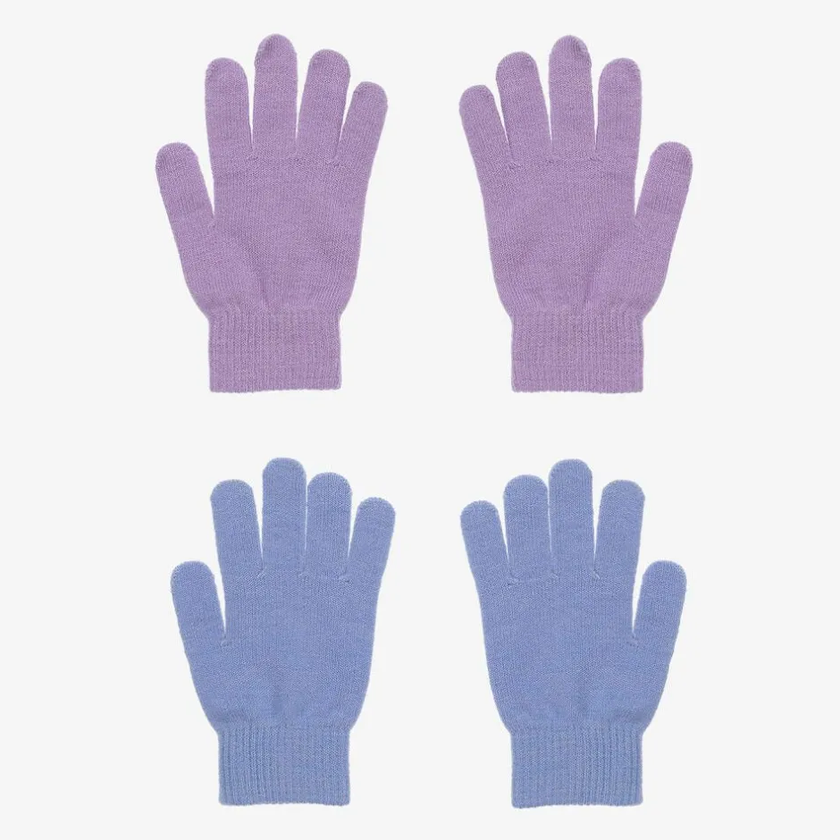 Lilac purple and blue gloves for boys and girls by Molo, in a useful pack of two. Warm and comfortable, they are knitted in a soft wool blend that is ideal for cooler temperatures.