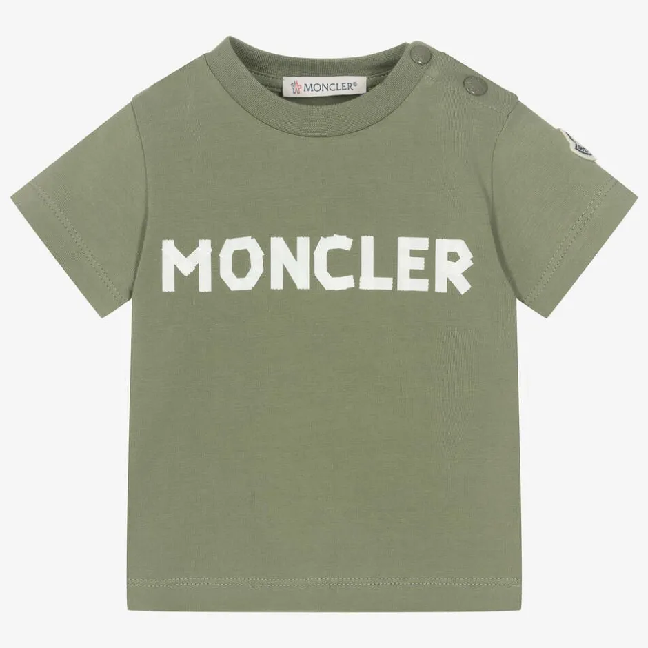 Khaki green cotton short-sleeved T-shirt for baby boys by luxury brand Moncler Enfant. The designer's name can be seen on the front in white tape-style print, with their iconic felt logo badge sewn on one sleeve. Made in comfortable jersey, this casual tee has shoulder popper fastenings to help with dressing.
