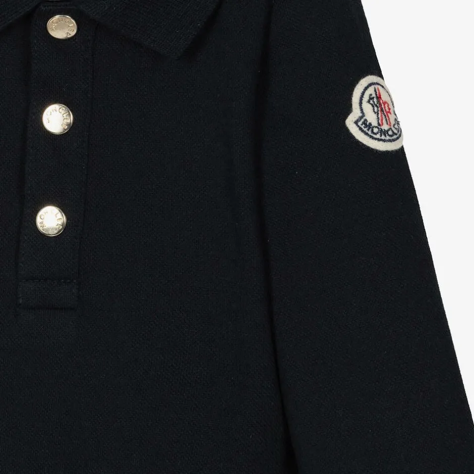 A lovely navy blue polo dress for baby girls by luxury brand Moncler Enfant. Made in soft and comfortable cotton piqué, it has a dropped waist and a sweet pleated skirt. The signature felt patch is stitched on one of the long sleeves and there are embossed gold popper fastenings on the front.