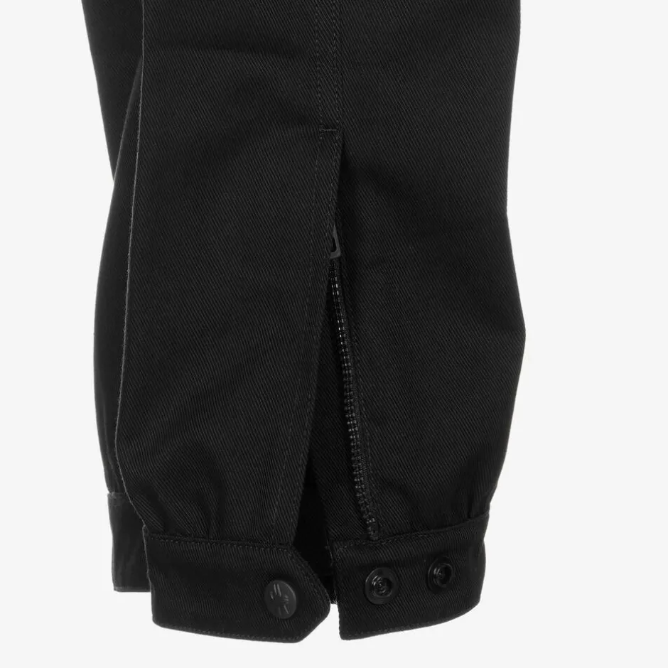 Black cotton trousers for girls and boys by luxury French brand Moncler. As part of the 'Born to Protect' capsule, they are made entirely of recycled cotton twill and satin, They have a satin waistband and a 'Born to Protect' logo embroidered with recycled thread on one of the front patch pockets. The cuffs fasten with zips and adjustable logo poppers. There are logo poppers on the back pockets, with the brand's signature felted logo badge on one side.