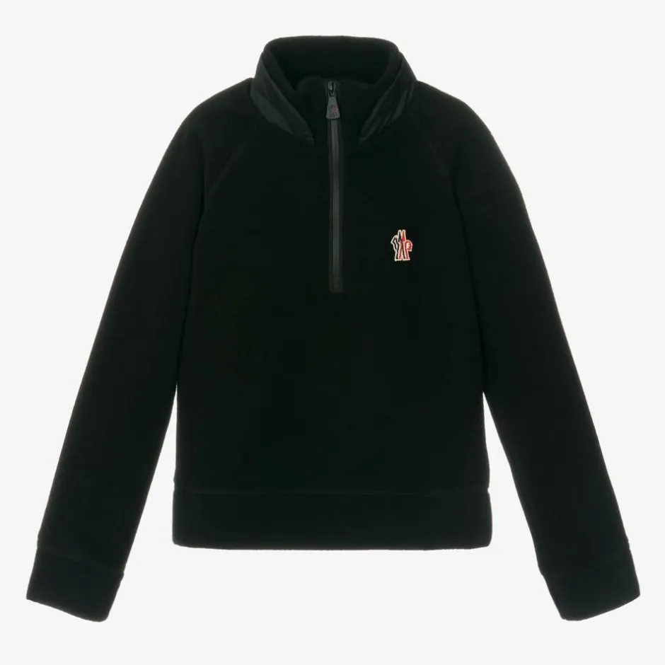 Part of the brand's Grenoble collection, this black fleece top for boys and girls is a Mini-me style by luxury brand Moncler Enfant. Made from beautifully soft and stretchy fleece, it offers extra warmth and added protection against the elements. A stylish base layer for the slopes, it features a taped half-zip fastening and a high collar with the label's padded signature nylon fabric trim. The embroidered logo patch and black zip pull add signature detailing.