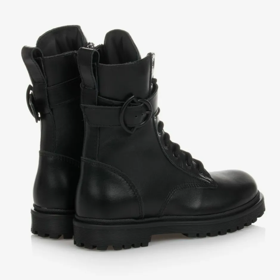 Mini-me, black lace-up ankle boots for girls and boys by luxury brand, Moncler Enfant. Made and lined in soft, supple leather, they have logo branded detail on the tongue and ankle strap. There is a side zip fastening and the boots have a chunky cleated outsole, providing superior protection and traction.